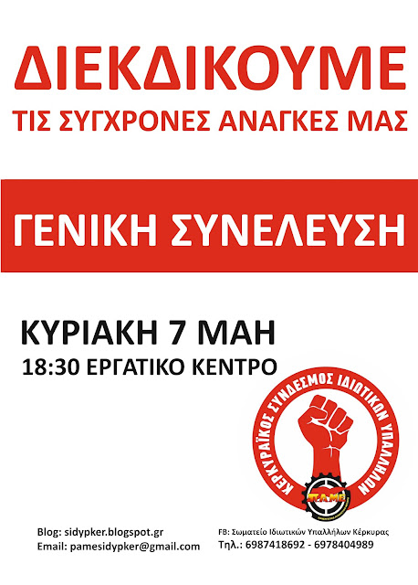 Όλες και όλοι, στη Γενική Συνέλευση του Σωματείου μας την Κυριακή 7 Μάη, στις 18:30 στο Εργατικό Κέντρο